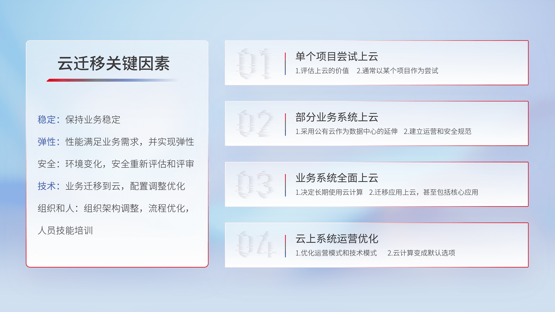 结合实际业务,,,从规划设计、、、、云平台选型、、、云原生改造、、、数据迁移、、集成交付,,迁移全过程为客户识别最佳上云路径,,,,做好风险识别管理,,设计网络架构、、、、身份权限、、、安全审计合规、、、、操作审计、、、日志审计、、、监控告警策略、、多站点容灾设计等,,,,对云上基础设施进行整体规划,,,提升IT治理水平,,,以满足弹性、、高可用、、高性能的需求。。。。