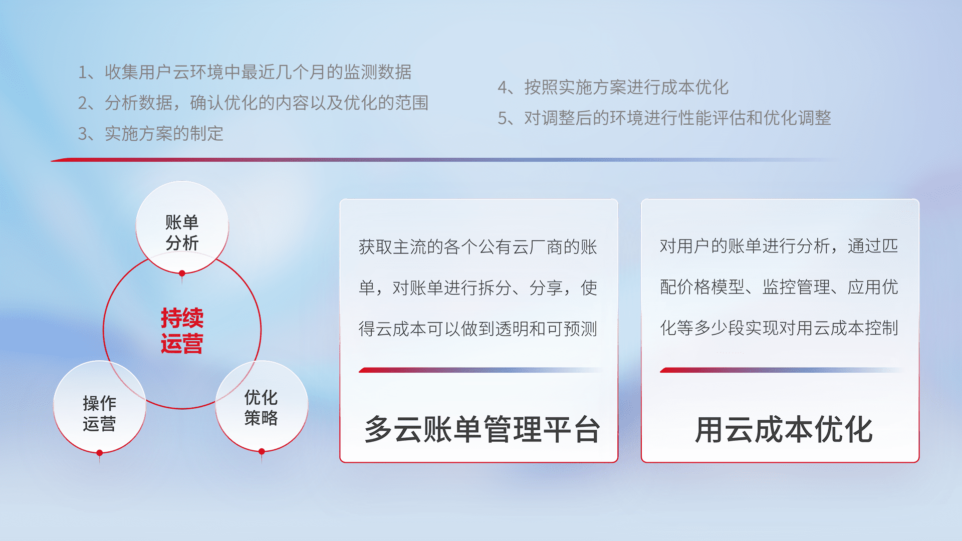 通过多云纳管,,,以统一的资源数据模型把客户的云资源进行抽象和封装,,,进而实现对多云资源的统一操作,,,,保障云资源管理的可靠性、、稳定性与可用性。。量身定制化运维内容,,,,配置、、、开发运维、、、补丁管理、、、备份、、、、监控、、认证和访问管理、、、审计和日常巡检等,,保障在用云过程中的可靠度,,,,稳定度以及高可用率。。